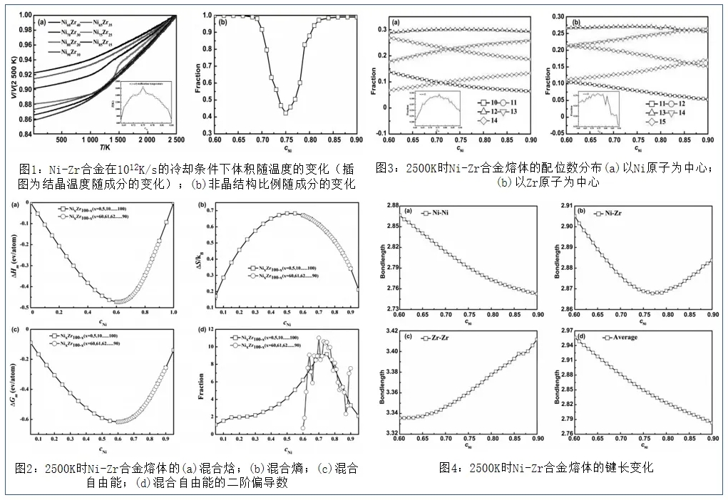 来自太原理工大学的潘少鹏等采用分子动力学模拟的方法,以Ni-Zr为初始模型,对降温过程中体积的变化以及高温熔体的热力学参数、相关结构参数方面进行分析,分析影响其非晶形成能力的因素。相关研究成果在《功能材料》上发表。